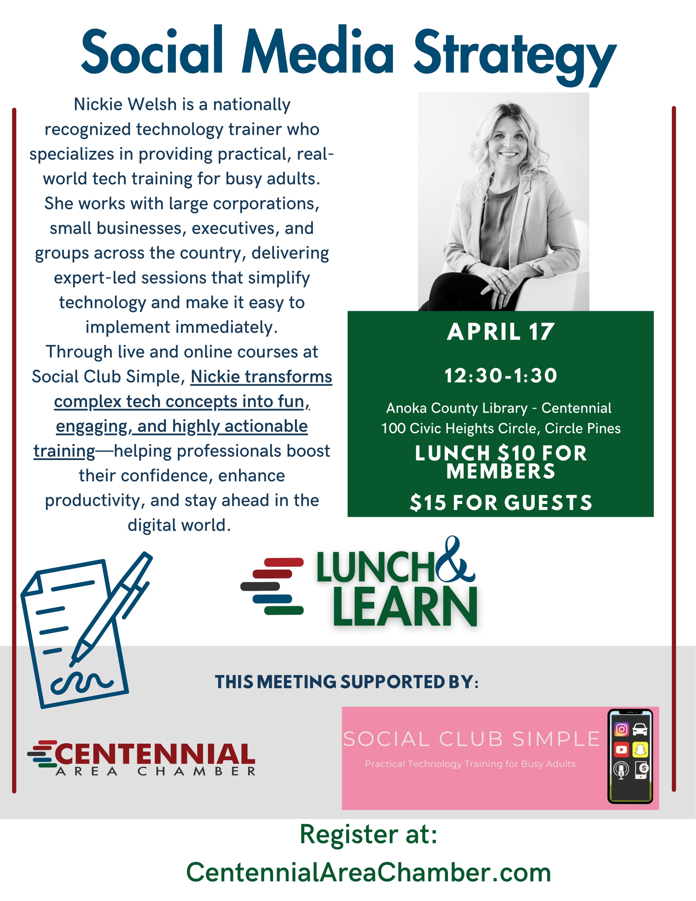 Join us for our monthly Lunch & Learns held the third Thursday of each month from 11:30am - 1pm (Except note there is a time change for the April Lunch & Learn). Locations for our lunches rotate throughout the Centennial Area.